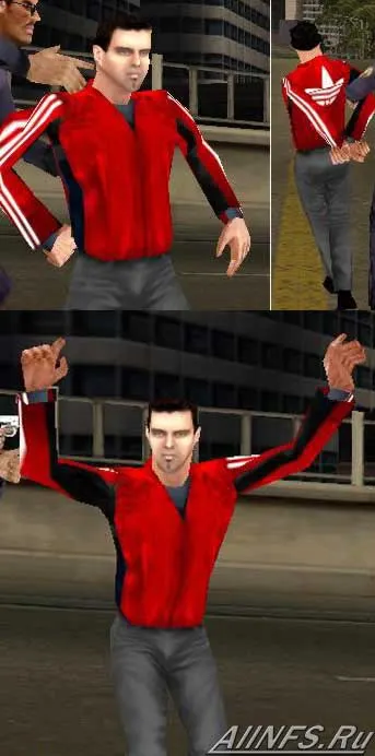 Водитель в красной куртке ADIDAS и в серых штанах.