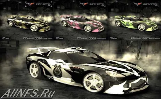 Как устанавливать: Извлечь файлы из архива. Открыть с помощью программы MWTex файл CARSCORVETTEVINYLS.BIN (Правой кнопкой -> Load). Найти строчку номер 131, выделить её, нажать правой кнопкой -> Import, выбрать файл CORVETTEUNIQUE04.DDS и нажать "Открыть". Далее выделяем строчку 51 и правой кнопкой -> Import, выбираем файл CORVETTEUNIQUE04_MASK.DDS. Закрываем программу. Не забудьте сделать резервную копию файла VINYLS.BIN!